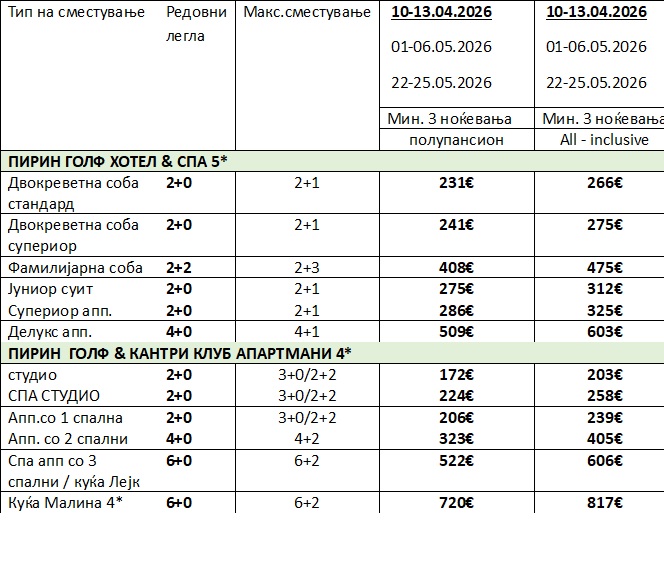 Празнична програма 10.04-13.04.2026Додека децата се забавуваат, Вие си одмарате10 тиАприл- петoкОд 15:00(Хотелска рецепција) Сместување и чаша вино за добредојде16:30–18:00 (Спа центар) Слободно време за користење на СПА центарот18:30-22:30 Тематична вечера на шведска маса во ресторан Euro Kitchen со саксофонист воживо20:00-21:00 (Пијано бар) Детска дискотека во пијано бар Мелоди11тиАприл – сабота07:00-10:00 Појадок во р-т Euro Kitchen10:00-12:00 (Let’s Bar) Детска работилница- Деца бојадисуваат јајца со Пепелашка.12:30-14:00 Ручек во р-т Euro Kitchen (вкл. за гостите на алл инклузив)14:30-15:30 (Голф игралиште) Голф час за возрасни со голф учител. Сорезервација пред 24ч .16:30-18:00 (Киносала) Детско кино за деца и родители со пуканки и природен сок.18:30-22:30 Вечера шведска маса во р-т Euro Kitchen22:00- 01:00 Трансфер до црква Св. Благовештение-Разлог12ти Април- недела07:00-10:00 Појадок во р-т Euro Kitchen10:00-12:00 (Пространство околу хотелот) Велигденски лов на јајца12:30-14:30 Традиционен неделен Велигденски ручек во р-т Euro Kitchen15:30-16:30 Голф час за деца со голф инструктор- резервирајте нарецепција на хотелот (над 6г)18:30-22:30 Празнична вечера во р-т Euro Kitchen со виолина20:00-21:00-(Пијано бар) Детска дискотека во пијано бар Мелоди13 тиАприл- понеделник07:00-10:00 Појадок -